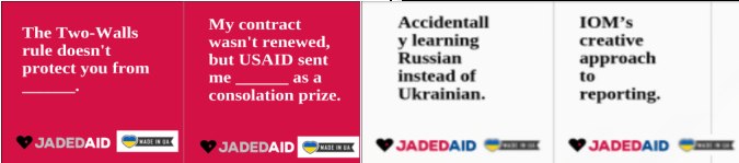 We also need some way to sort out all the bad blood we accumulate in this business day over day. To help on that, three geniuses invented in 2015 a version of cards against humanity specifically targeting the cynical soul of the field. It was called JadedAid.